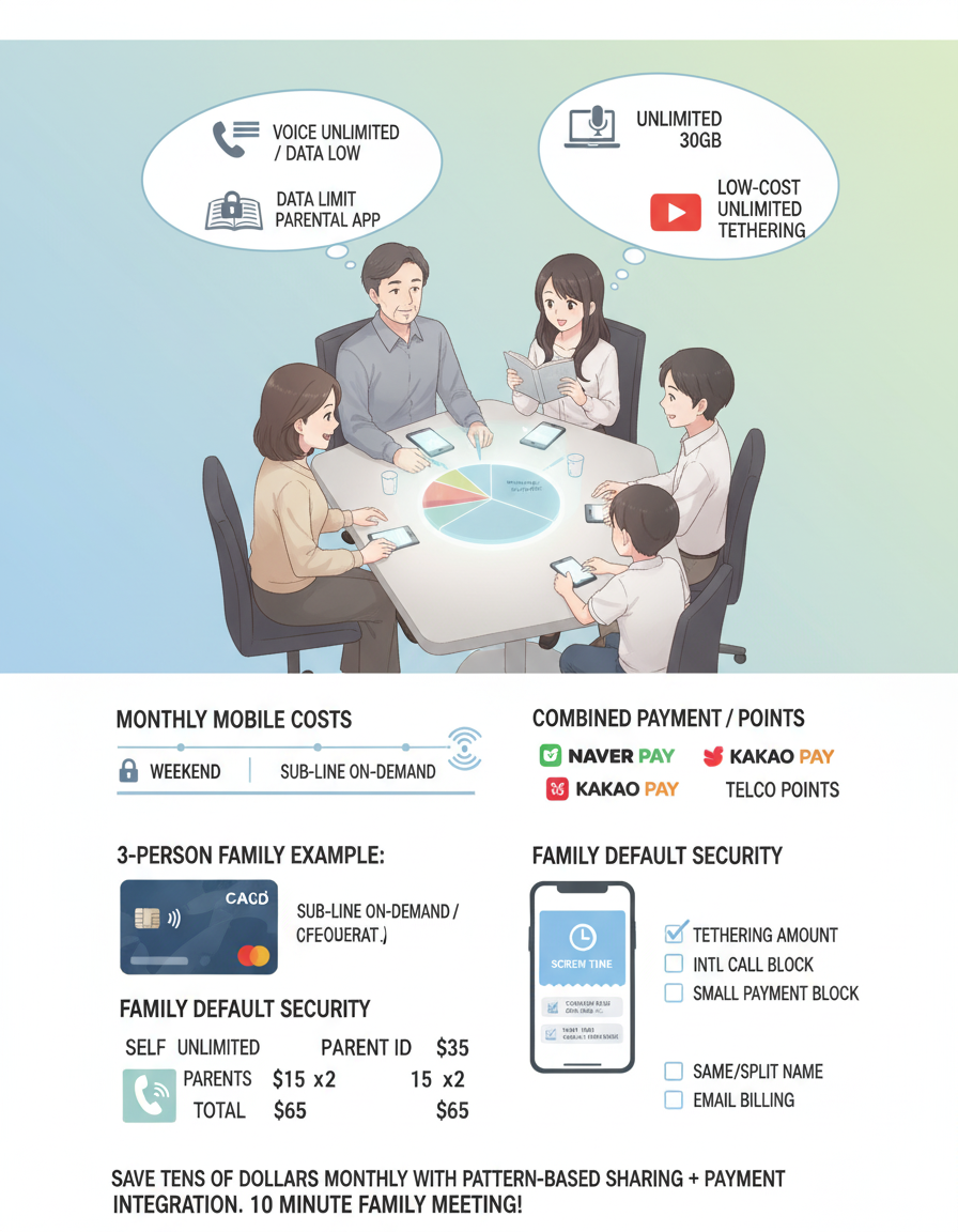 가족 전체 데이터를 한 명이 크게 쓰는 대신, 서브회선을 1-2개 두고 주말·여행 등 피크에만 켭니다. 이렇게 하면 메인 요금은 낮게 잡고, 필요할 때만 가변비용을 쓰는 구조가 됩니다.