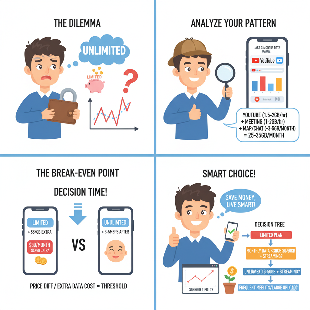 적정형 20~30GB 가격과 무제한 저가형(소진 후 3~5Mbps) 가격을 비교합니다. 가격 차/추가 데이터팩 비용이 임계점. 월 5GB 이상 초과가 일상적이면 무제한이 마음 편하고, 반대로 초과가 드물면 적정형이 절약입니다.