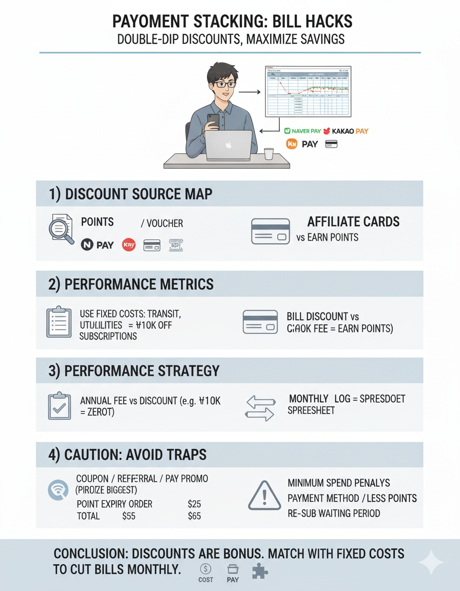 포인트는 만료일 순서로 소진하고, 통신비 자동이체는 가장 큰 청구할인 카드에 묶어 일관성을 유지하세요.