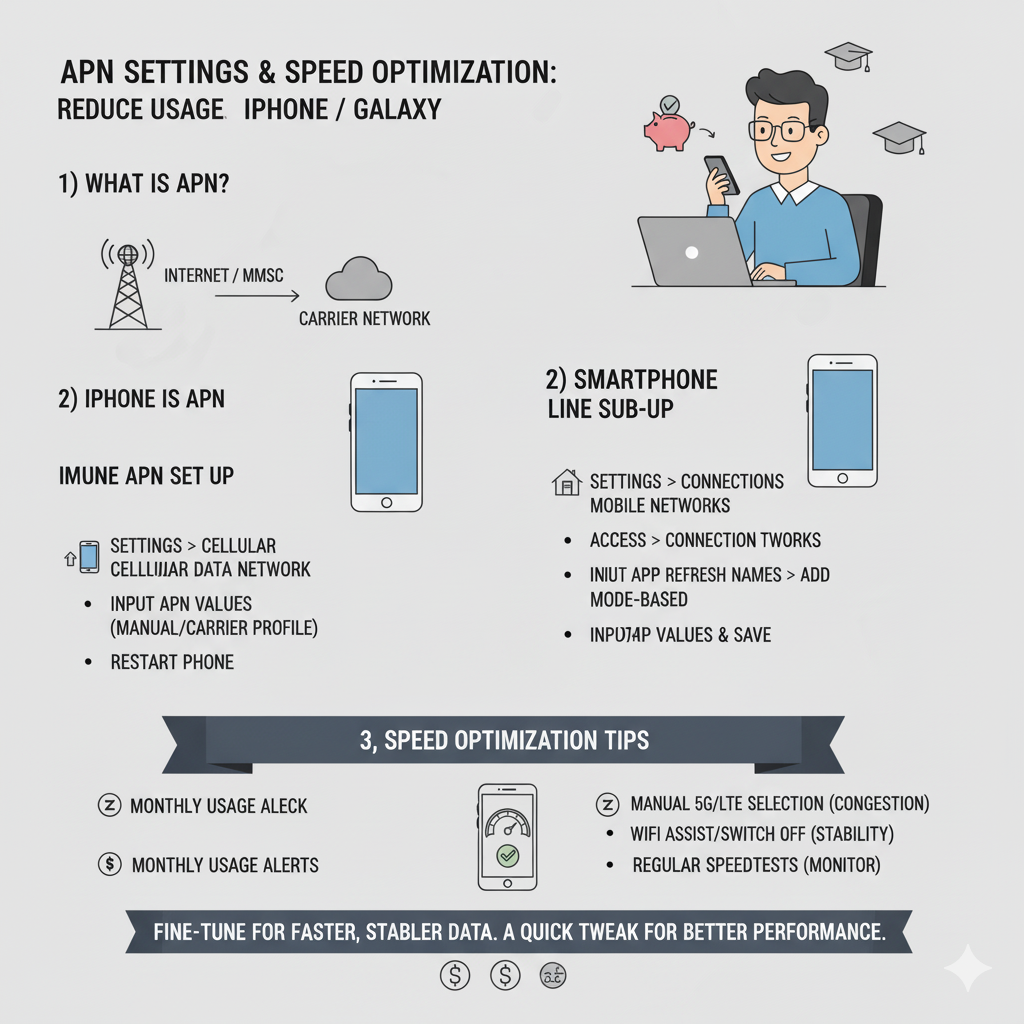 - 아이폰: 설정 → 셀룰러 → 셀룰러 데이터 옵션 → APN 자동(통신사 프로파일) 적용 확인. 수동 입력이 필요한 MVNO는 제공 문서대로 APN/사용자명/비번을 정확히 입력.