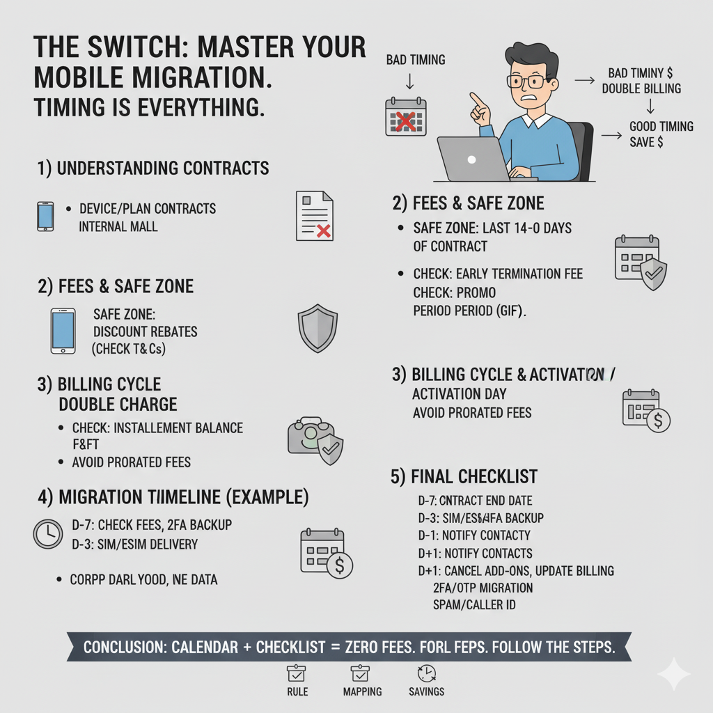갈아타기의 성패는 달력에 달려 있습니다. 날짜를 잘못 잡으면 위약금·이중 과금·사은품 취소까지 겹칩니다.