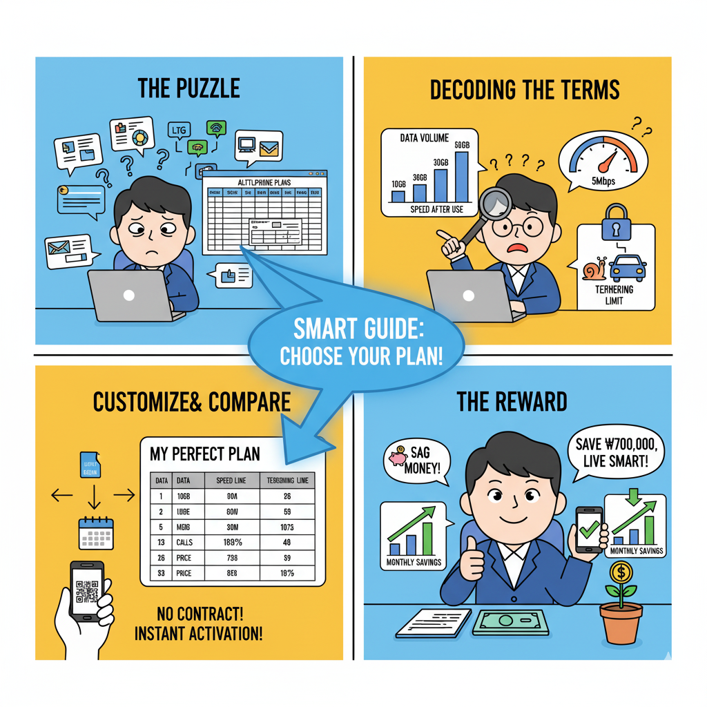 요금제 이름만 보면 감으로는 구분이 안 됩니다. 데이터 제공량, 소진 후 속도, 테더링 제한, 통화/문자 조건을 표로 놓고 보면 금세 선명해지죠. 이번 편은 2025년 기준 알뜰 요금제의 유형과 핵심 용어를 한 번에 정리합니다.