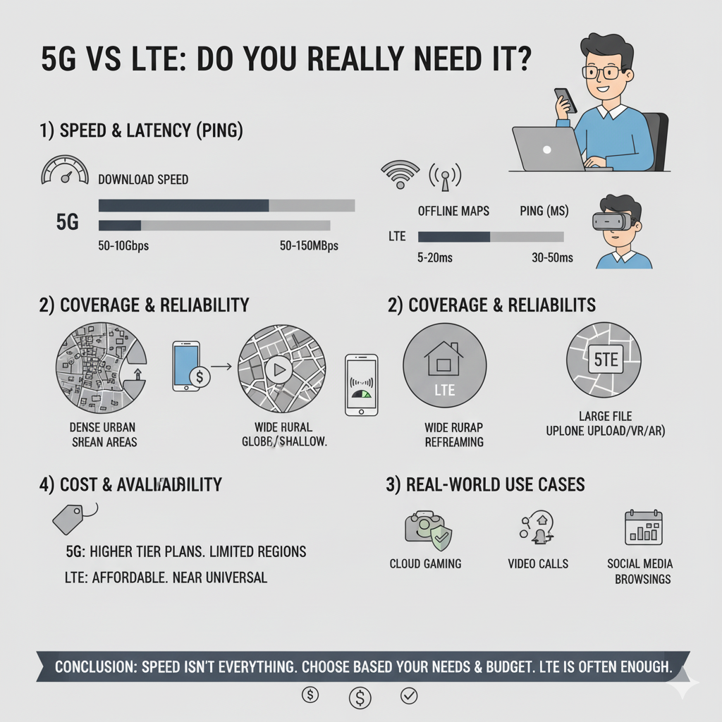 5G는 빠르고, LTE는 충분합니다. 중요한 건 내 업무와 동선입니다. ‘몇 G인가’보다 ‘언제 어디서 무엇을 하는가’가 비용/품질을 가릅니다.